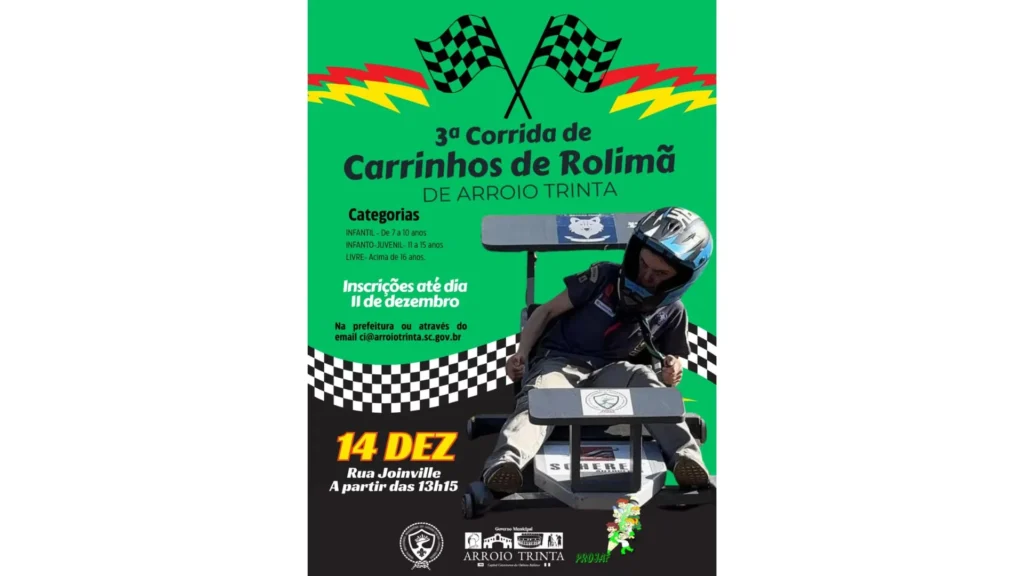 A Rua Joinville, no Centro de Arroio Trinta, será palco da 3ª edição da Corrida de Carrinhos de Rolimã, marcada para o dia 14 de dezembro de 2025. O evento promete resgatar a nostalgia e a adrenalina, reunindo famílias e participantes de toda a região.