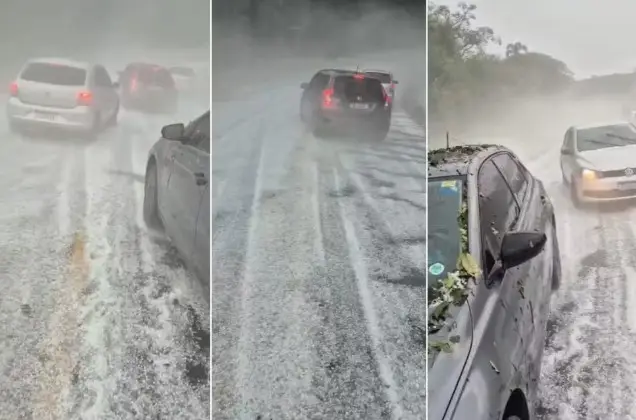 Motoristas que trafegavam por uma estrada entre Piedade e Ibiúna, no interior paulista, precisaram interromper o trajeto devido ao acúmulo de granizo na pista. As imagens mostram a intensa queda de pedras de gelo e a via completamente branca, com diversos veículos parados próximo à entrada do bairro Colégio.
