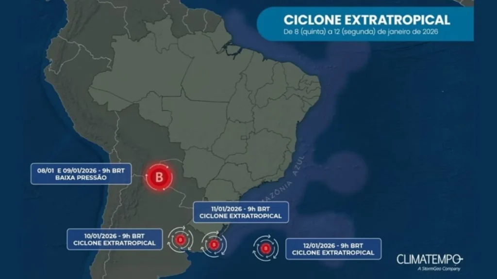 O primeiro ciclone de 2026 começa a se formar nesta sexta-feira (9) e deve provocar um fim de semana de tempo severo em parte do Brasil, com previsão de chuva volumosa, tempestades, ventos fortes e risco de granizo. O sistema tem origem em uma área de baixa pressão atmosférica que se intensifica entre esta sexta e o sábado (10), entre o Uruguai e o Rio Grande do Sul.