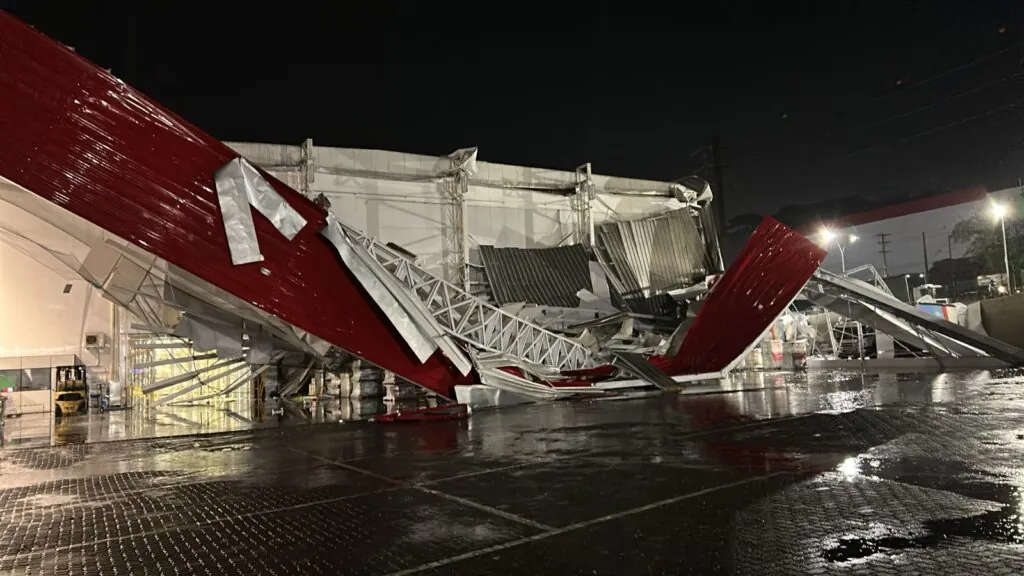 Imagens das câmeras de segurança de um posto de combustíveis próximo à rodovia mostram a intensidade dos ventos que antecederam o desabamento. A empresa foi a estrutura mais afetada entre todas as ocorrências registradas.