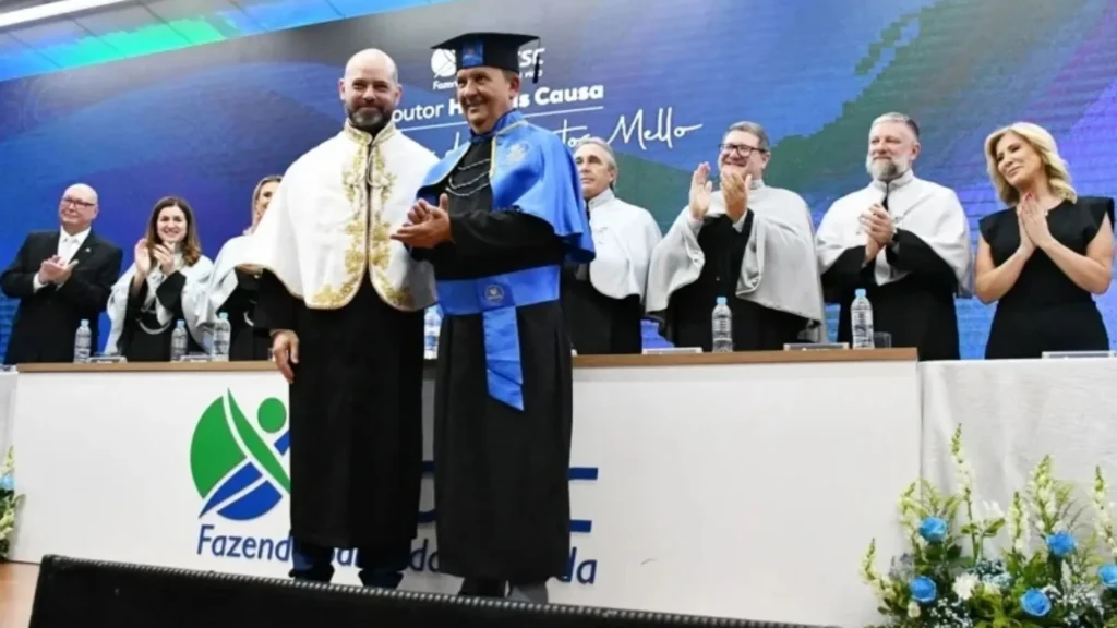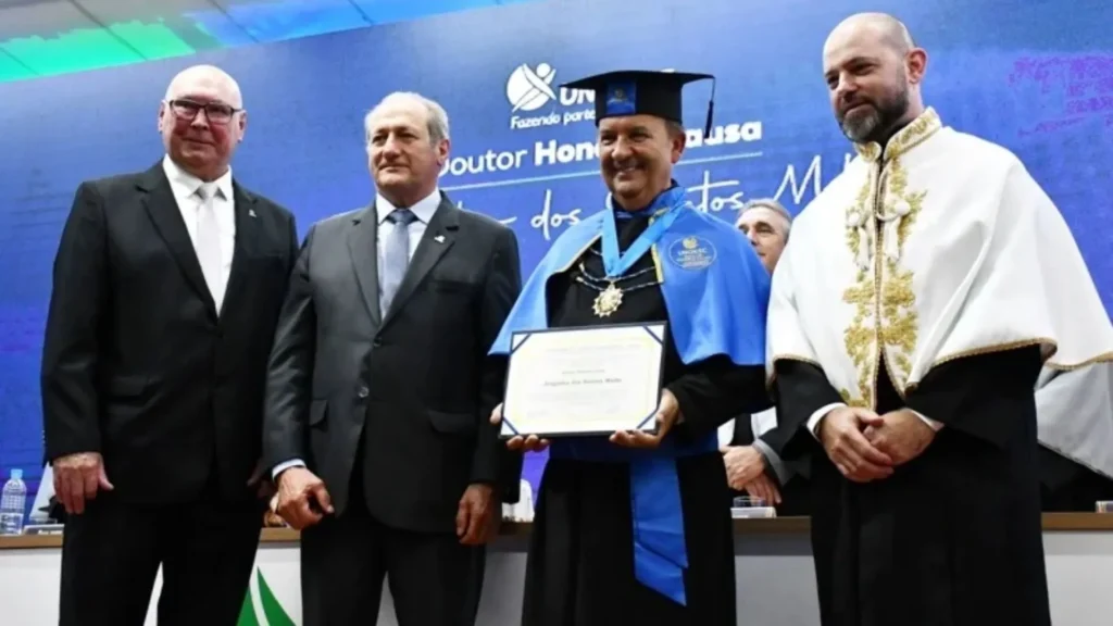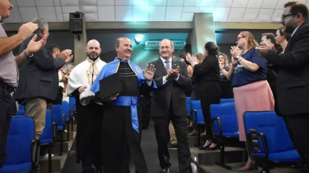 O momento central da solenidade foi a outorga do título, conduzida pelo reitor Ricardo Antonio De Marco, com entrega do diploma feita por Cimadon e entrega das insígnias pelo presidente da Funoesc, Genesio Téo.