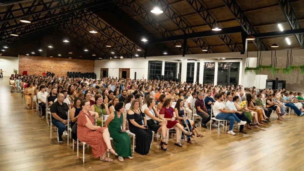 O evento aconteceu no Centro de Eventos do Parque da Uva e contou com a participação de cerca de 1.200 profissionais da educação, que se divertiram durante quase duas horas com as observações bem-humoradas de Almeida sobre comportamentos de professores e alunos em sala de aula.