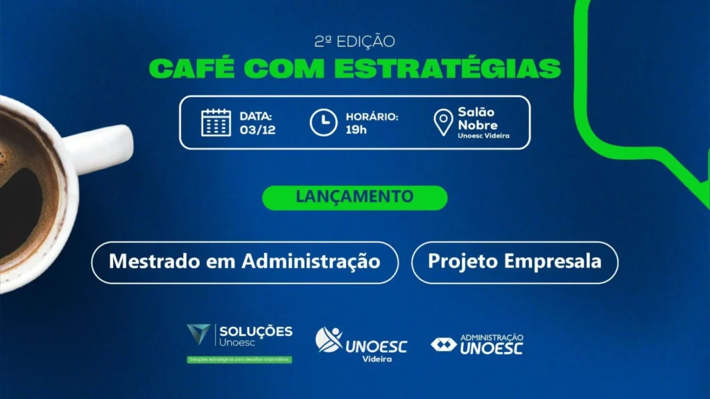 A Unoesc Videira realizará no dia 3 de dezembro o evento oficial que marca o lançamento do novo Mestrado em Administração, agora disponível no campus por meio da modalidade multicampi. A apresentação acontece no Salão Nobre da universidade e é destinada a gestores, empresários, profissionais do setor de negócios e demais interessados em avançar na formação acadêmica e ampliar competências estratégicas.