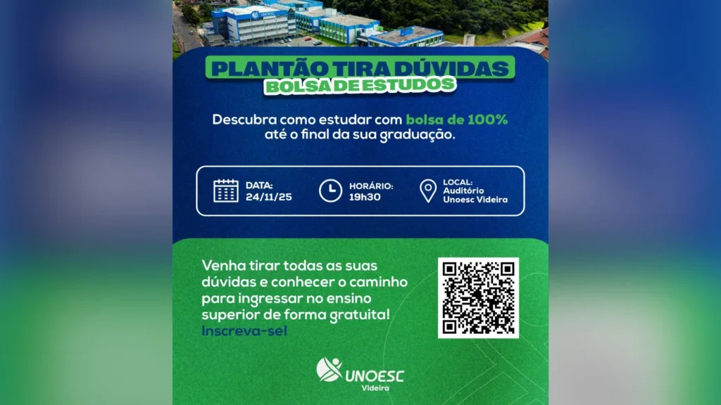 A Unoesc Videira realiza, no dia 24 de novembro, às 19h30, no Auditório da Universidade, uma sessão especial voltada a esclarecer o funcionamento do Programa Universidade Gratuita. A ação é destinada a pais, responsáveis e futuros acadêmicos que desejam entender como acessar o benefício de forma segura e organizada.