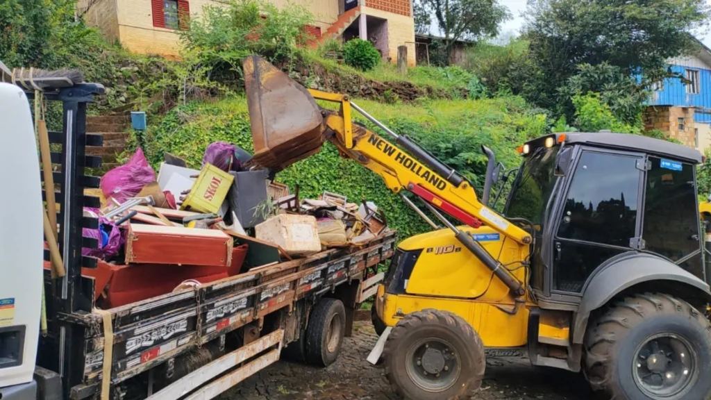 Durante toda a manhã, máquinas, caminhões e equipes da Prefeitura, juntamente com voluntários, percorreram as ruas do bairro recolhendo os materiais previamente colocados nas calçadas pelos moradores.