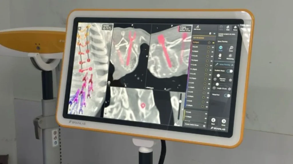 Foi usado o método de neuronavegação — tecnologia comparada a um GPS cirúrgico — aliada à modelagem tridimensional da coluna vertebral