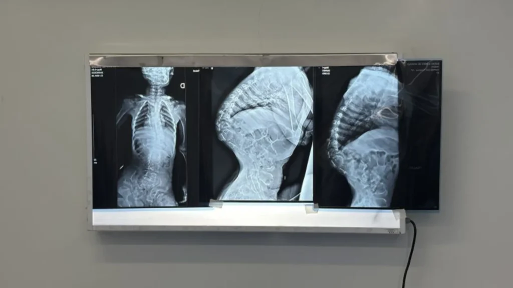 A criança é portadora de uma displasia esquelética rara, enfermidade que causa deformidades severas na coluna vertebral e pode comprometer funções neurológicas e respiratórias. Sem acesso a tratamento especializado nos primeiros anos de vida, a condição evoluiu para compressão da medula espinhal em diversos níveis, resultando em paraplegia, perda de sensibilidade nos membros inferiores e dificuldades respiratórias e alimentares.