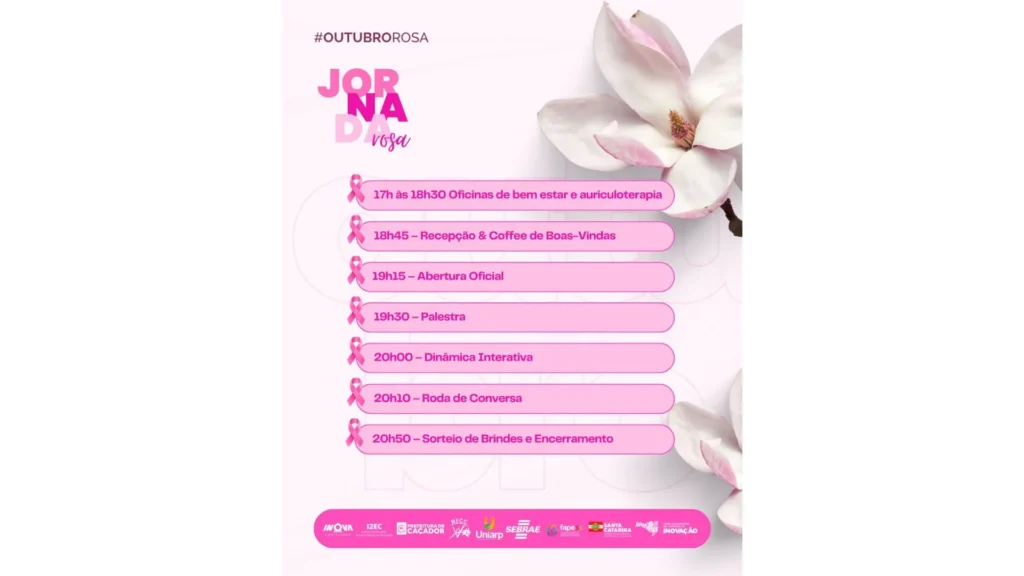 Local: Centro de Inovação Inova Contestado – Rua Nereu Ramos, 273, Centro, Caçador/SC Inscrições: https://www.sympla.com.br/evento/jornada-rosa—um-encontro-de-mulheres-pela-vida/3160671