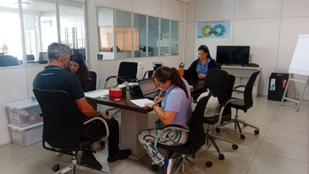 Uma equipe composta por médica, enfermeira e técnica de enfermagem realiza visitas periódicas às empresas, oferecendo consultas individuais e personalizadas para os funcionários.