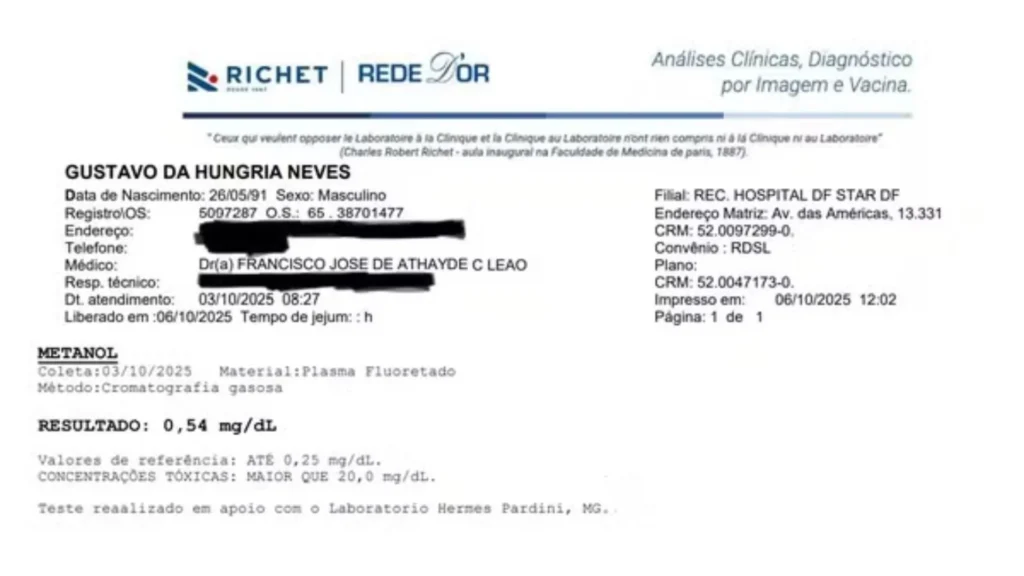 “De acordo com exames laboratoriais realizados pelo Laboratório Richet, da Rede D’Or, cujo resultado foi liberado em 06 de outubro, foi detectada a presença de metanol no sangue (0,54 mg/dL), acima do limite de referência (até 0,25 mg/dL). O resultado confirma a exposição à substância, e a equipe médica aguarda os exames de contraprova”, informou a assessoria.
