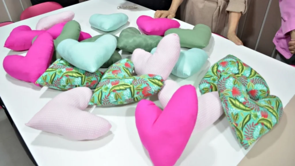 Após a cirurgia, muitas mulheres enfrentam dificuldades para movimentar o braço. Pensando nisso, as artesãs criaram almofadas em formato de coração que servem de apoio, oferecendo conforto e alívio no pós-operatório. Assim nasceu o Projeto Corações Solidários, apresentado ao Fundo Social Sicredi para apoio financeiro.
