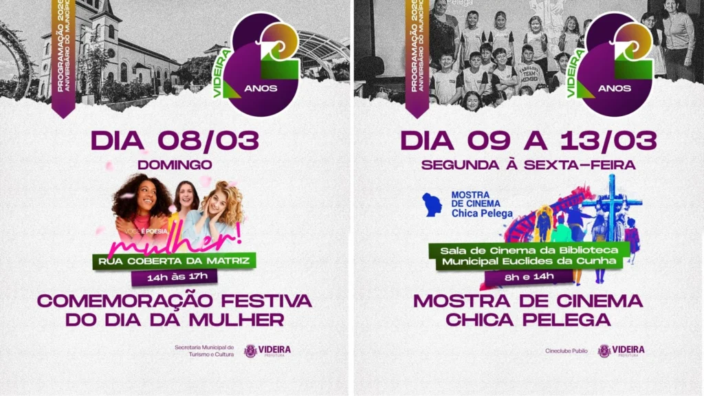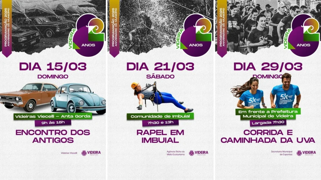 Videira vai comemorar seus 82 anos em grande estilo, com uma programação diversificada organizada pela Secretaria de Turismo e Cultura, que promete atender a todos os públicos. As celebrações começam no dia 28 de fevereiro e seguem até o final de março, incluindo música, esportes, cinema, encontros culturais e muita diversão para toda a família.