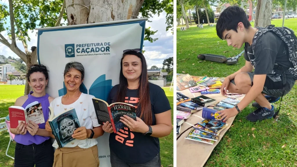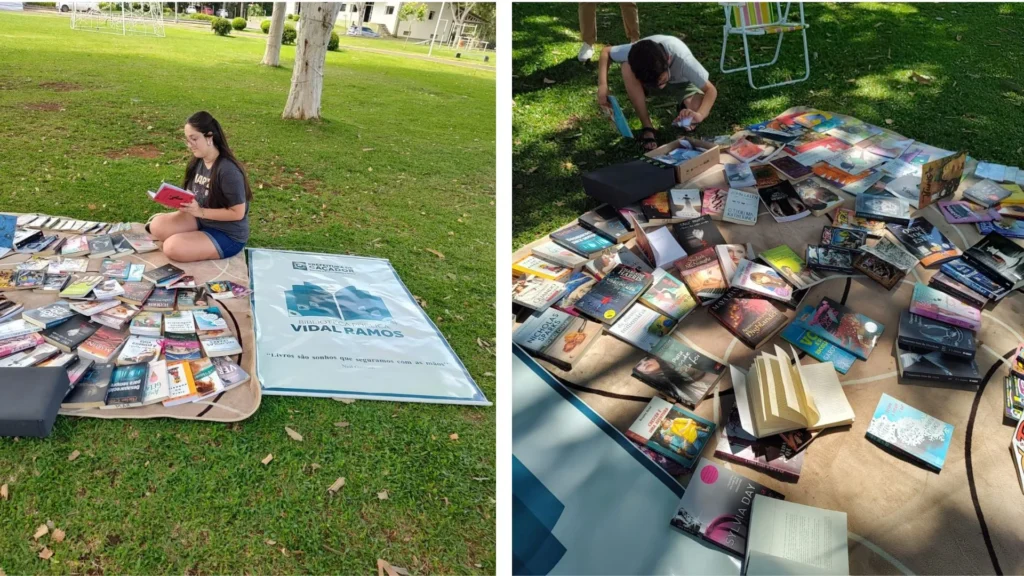 Durante a ação, foi montado um espaço ao ar livre com livros de diversos gêneros literários, permitindo que quem passasse pelo parque escolhesse um título e dedicasse um momento à leitura.