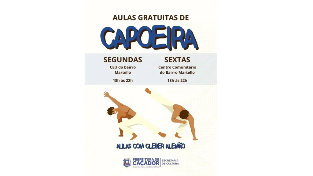 A Prefeitura de Caçador, por meio da Secretaria de Cultura, está promovendo inscrições para aulas gratuitas de capoeira destinadas à comunidade. As atividades serão realizadas em dois pontos do bairro Martello, ampliando o acesso dos moradores à prática esportiva e cultural.