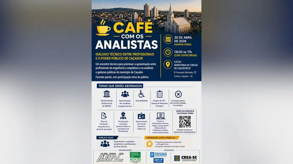 O município de Caçador receberá o evento “Café com os Analistas”, um encontro técnico voltado à integração entre profissionais das áreas de engenharia e arquitetura, analistas e gestores públicos locais.