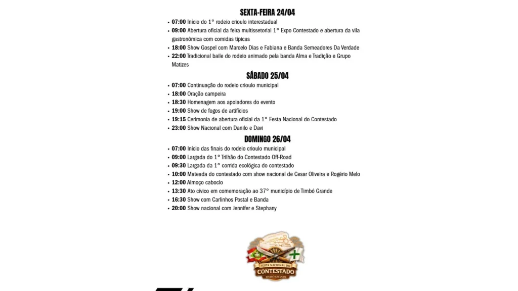 A programação oficial da 1ª Festa Nacional do Contestado, em Timbó Grande, foi divulgada e reúne uma série de atrações culturais, esportivas e musicais entre os dias 24 e 26 de abril. O evento promete movimentar o município para celebrar o aniversário de 37 anos de emancipação.