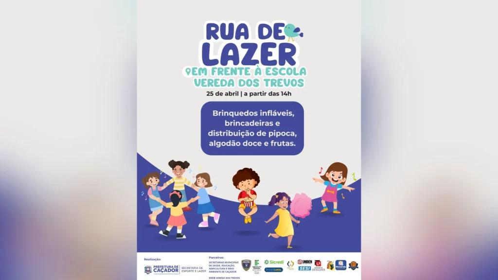 A Prefeitura de Caçador promove, neste sábado (25), mais uma edição da tradicional Rua de Lazer, iniciativa voltada ao entretenimento de famílias e crianças do município. Desta vez, a programação acontece em frente à Escola Municipal de Educação Básica Vereda dos Trevos, localizada na rua Ivete Zini, número 35.