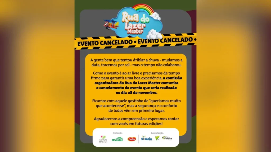 A segunda edição da Rua do Lazer, programada para sábado, 8 de novembro, foi oficialmente cancelada pela organização do evento. A decisão foi tomada após a constatação de previsão de chuva e tempo instável na cidade de Videira, tornando inviável a realização da atividade com segurança e conforto para o público.