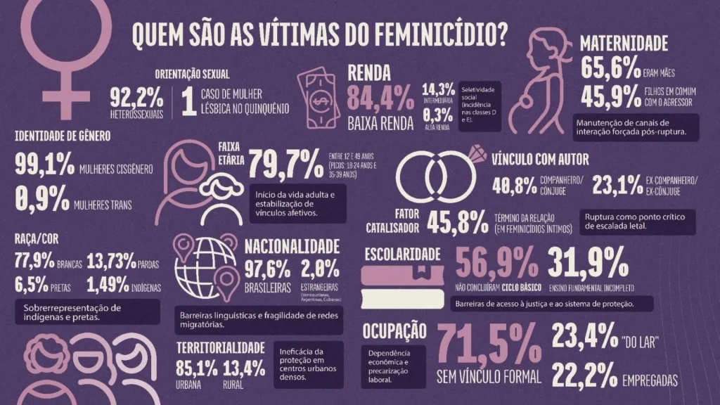 Além disso, os dados apontam que o fenômeno atinge com maior intensidade mulheres na base da pirâmide socioeconômica, com baixa escolaridade e renda familiar limitada, evidenciando a relação entre vulnerabilidade social e feminicídio.