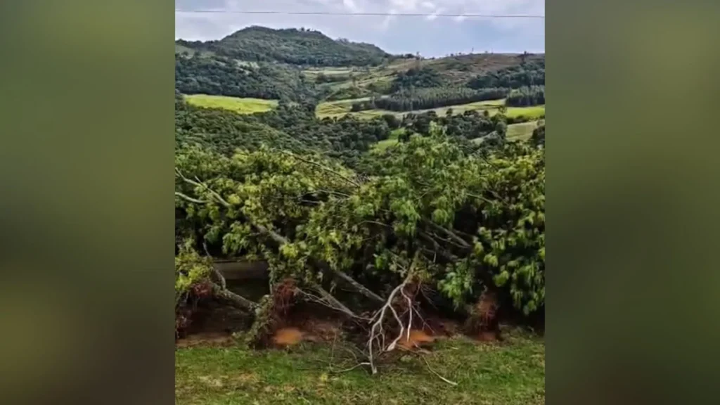 O temporal não poupou as áreas rurais. Árvores derrubadas pelos ventos atingiram uma granja de suínos, provocando danos materiais.