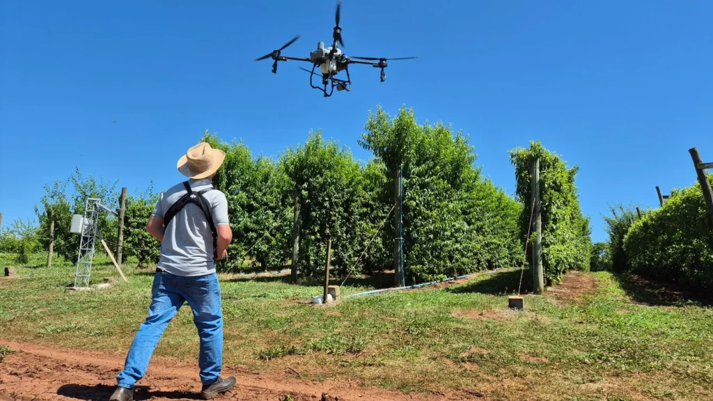 O drone está sendo testado em culturas como pêssego, ameixa, nectarina e também na viticultura. Os voos são realizados na própria área experimental da Epagri, mas também em propriedades particulares. O objetivo é validar ações de pesquisa para entender como fazer pulverizações com drones em fruticultura.