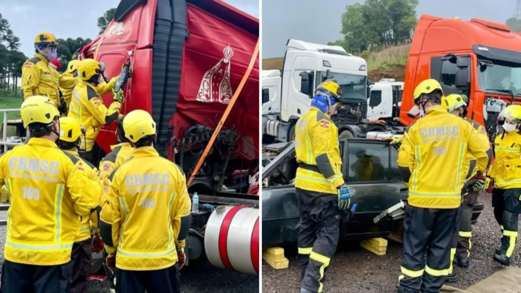 Os bombeiros enfrentaram simulações realistas de acidentes envolvendo veículos leves e pesados, aplicando técnicas de salvamento e extração com foco na segurança das vítimas e da equipe.