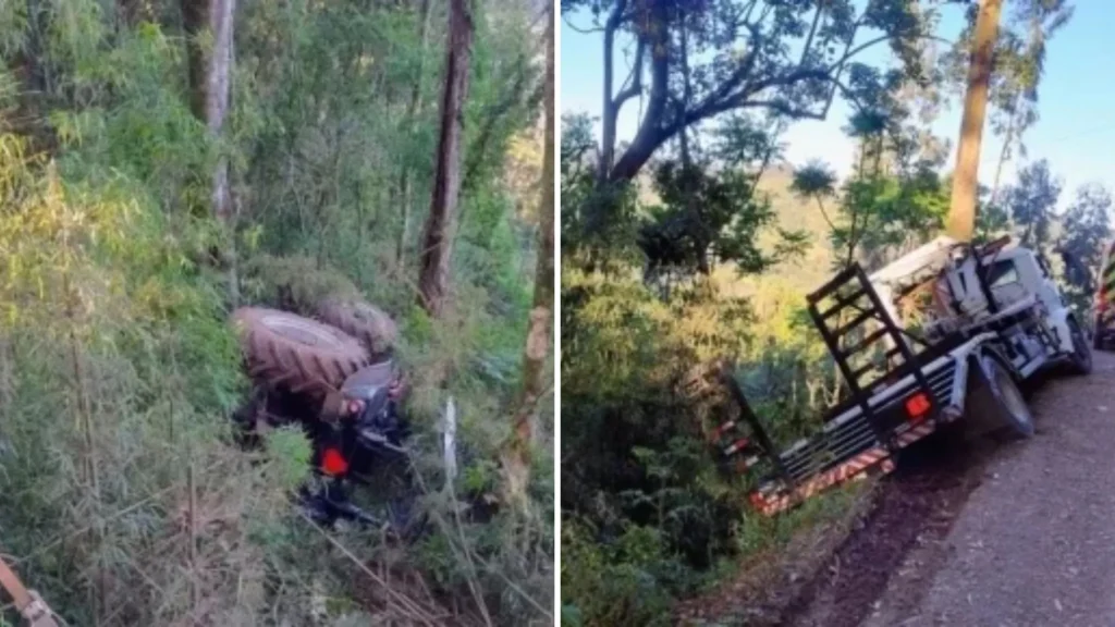 Um caminhão prancha que transportava um trator agrícola saiu da pista e colidiu contra um eucalipto, na tarde desta terça-feira (14). O acidente ocorreu na estrada que dá acesso à comunidade de Linha Pingador, interior de Irani. Com o forte impacto, o trator se soltou da carroceria e despencou em uma ribanceira próxima ao local da colisão.