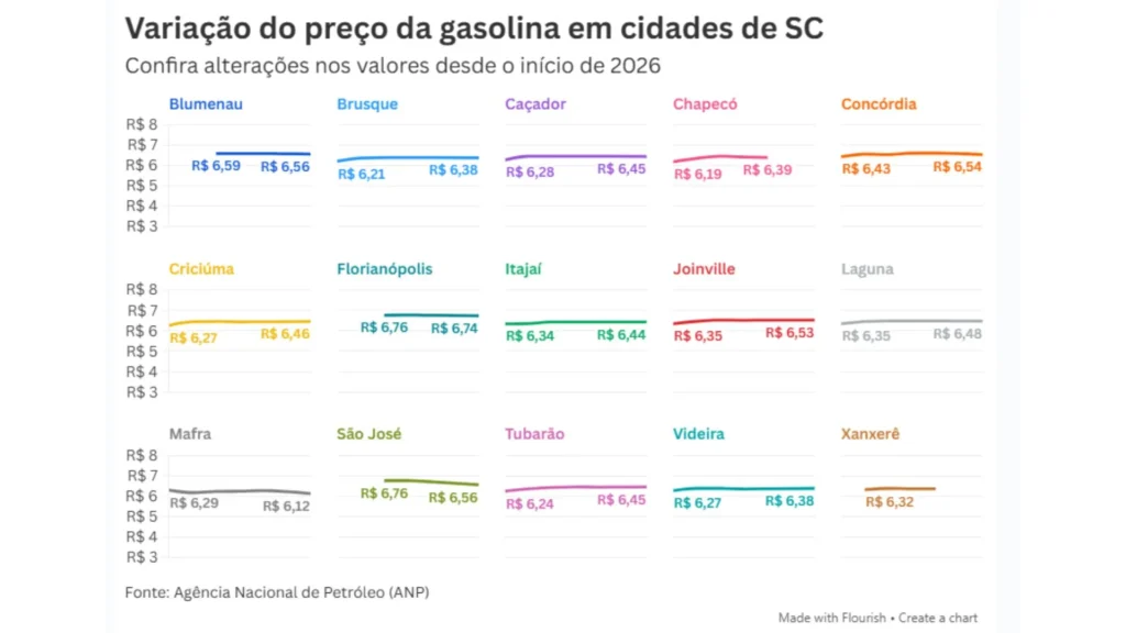 Assim, embora o corte anunciado pela Petrobras tenha criado uma perspectiva de queda, fatores como o reajuste do ICMS e o encarecimento do etanol seguem pressionando os valores praticados. A análise dos preços médios nas 15 cidades catarinenses monitoradas pela ANP revela comportamentos distintos: enquanto algumas registraram aumento, outras apresentaram redução, mesmo após a elevação do imposto estadual.