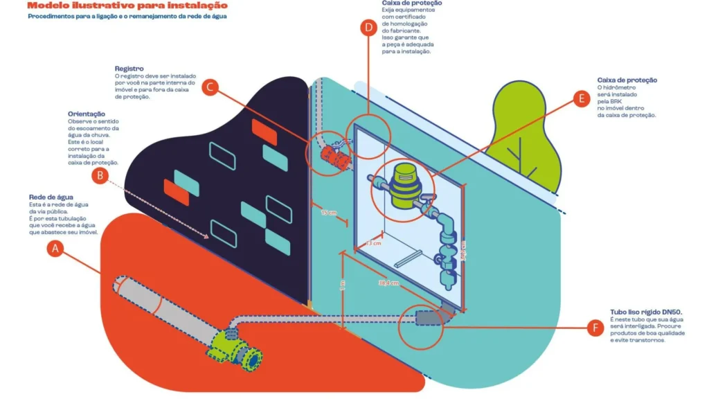 Para orientar os moradores sobre as condições adequadas de instalação, a BRK disponibiliza em seus pontos de atendimento presencial o modelo correto da caixa padrão, estrutura destinada a abrigar o hidrômetro de forma segura e acessível.