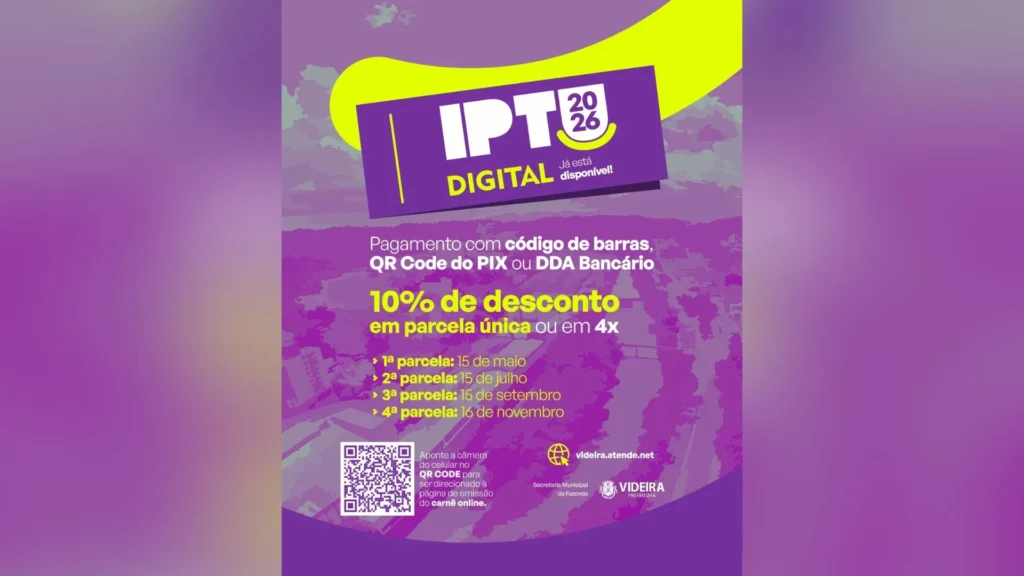 Para acessar a guia, basta entrar na aba “Boleto de IPTU – 2026” no site da Prefeitura ou usar o link direto: https://videira.atende.net/autoatendimento/servicos/guias-de-iptu/load/0. É necessário informar o CPF e a inscrição imobiliária.