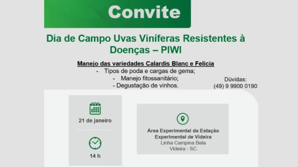 O Dia de Campo também contará com degustação de vinhos produzidos com as uvas demonstradas, permitindo que os participantes avaliem diretamente a qualidade enológica das variedades Piwi.