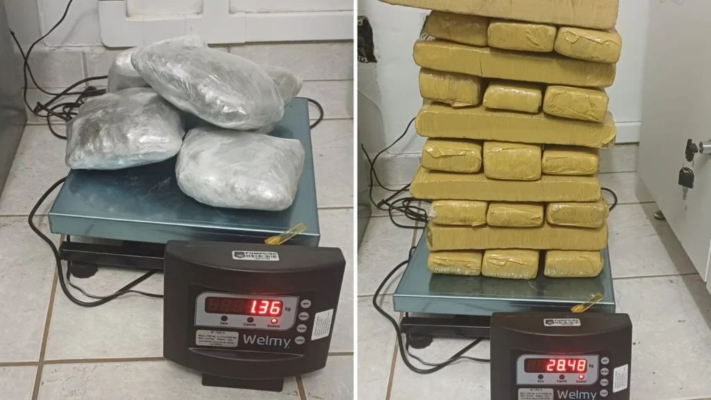 Após a colisão, os policiais realizaram a abordagem e encontraram, no interior do veículo, uma mochila contendo aproximadamente 30 quilos de entorpecentes, entre skunk e maconha. O material foi apreendido e encaminhado para os procedimentos legais.