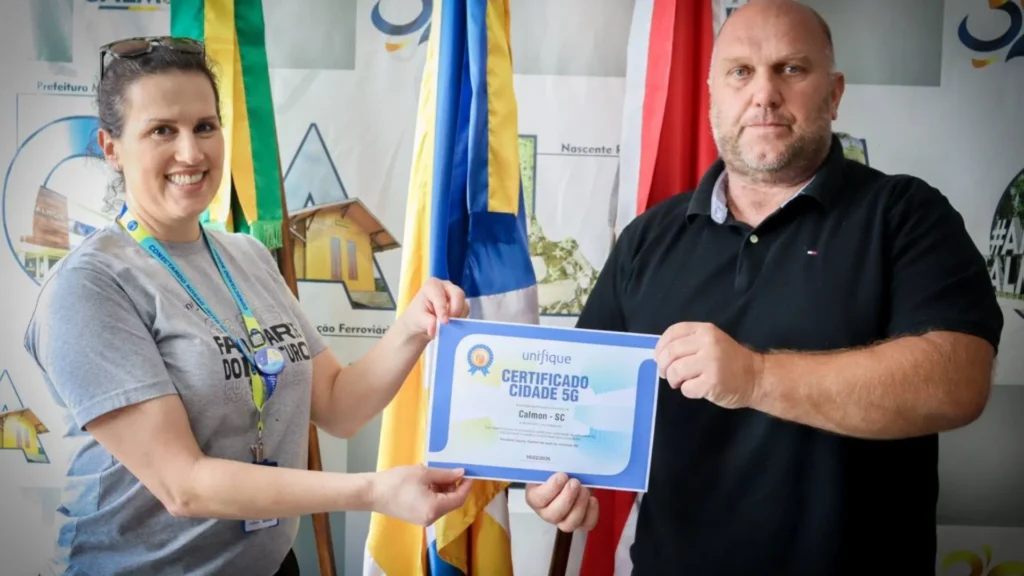 A certificação reconhece o município pela implantação da rede móvel de quinta geração, posicionando Calmon entre as cidades que já contam com a nova tecnologia. O documento foi entregue diretamente ao chefe do Executivo municipal.