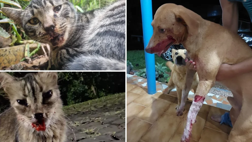 Há registros de animais com queimaduras, ferimentos graves e até mutilações, como cortes em orelhas e caudas.