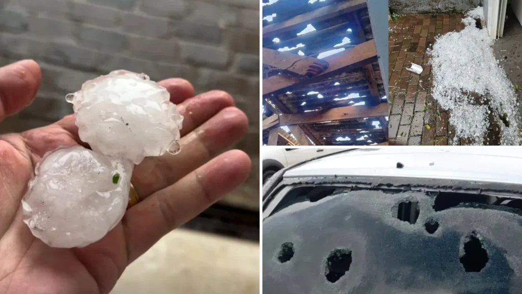 Imagens compartilhadas por moradores mostram grandes pedras de gelo destruindo telhados e veículos, incluindo vidros quebrados.