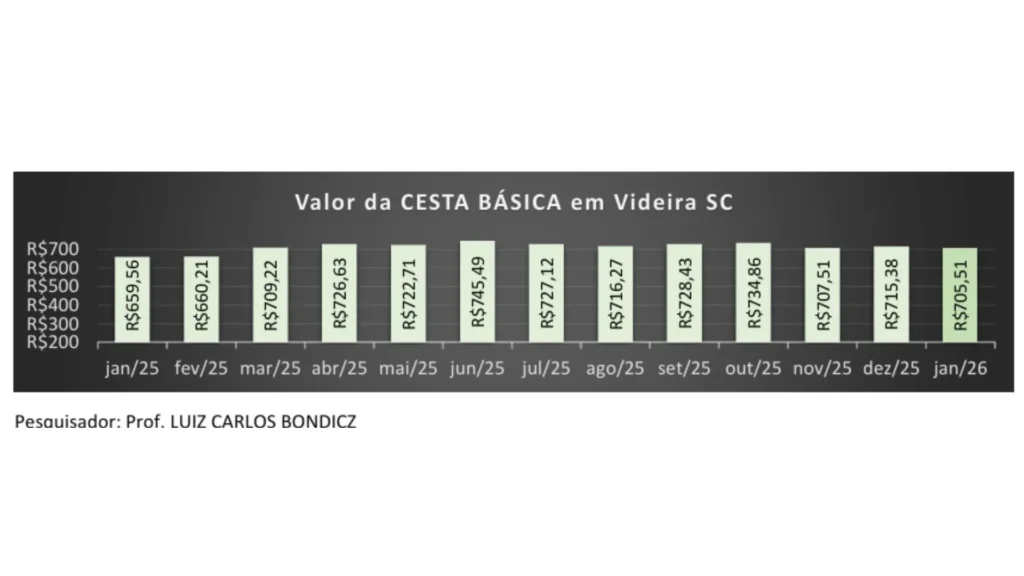 A pesquisa realizada pelo professor Luiz Carlos Bondicz, que acompanha mensalmente a variação de preços de produtos alimentícios em oito estabelecimentos de Videira, mostrou que os preços caíram em janeiro de 2026 na comparação com dezembro de 2025. Mesmo assim, quando comparados com janeiro do ano passado, os valores acumulam um aumento de 6,97% em 12 meses, impactando diretamente o orçamento das famílias.