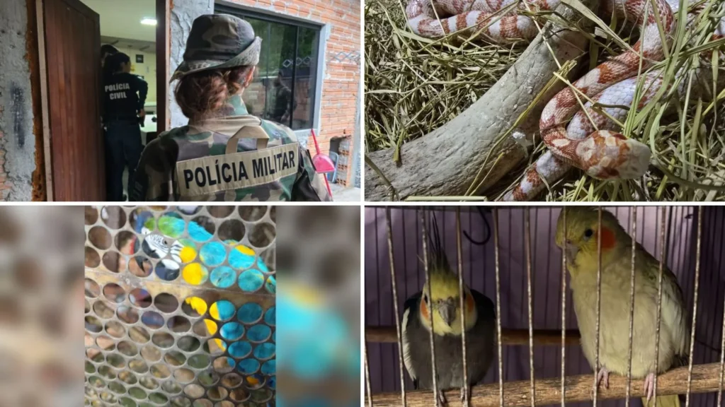 Entre os animais resgatados estava uma cobra-do-milho, espécie exótica nativa dos Estados Unidos, conhecida pelo corpo esguio e cabeça levemente triangular. Além dela, foram apreendidos um tucano, um papagaio e diversos pássaros.