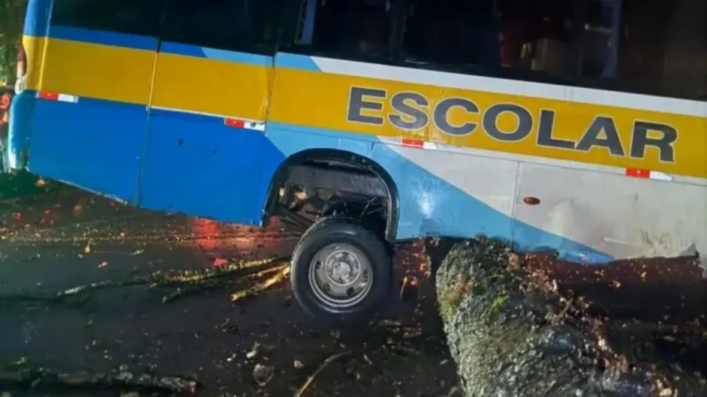 Um micro-ônibus escolar se envolveu em um acidente na noite desta terça-feira (17) após colidir contra um pinheiro araucária de grande porte que havia caído sobre a pista durante um temporal.