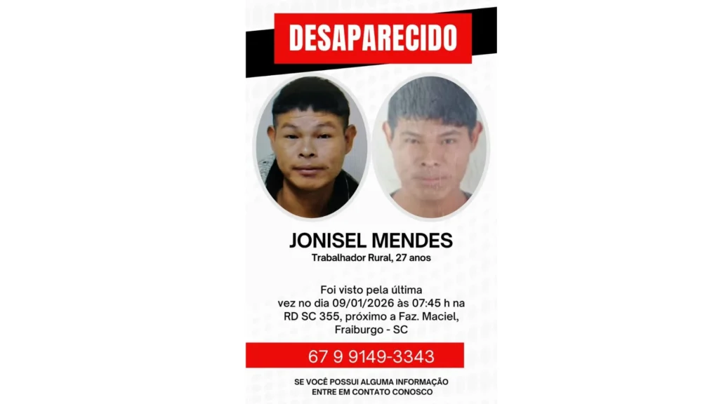 O desaparecido, um homem de 27 anos, teria sido visto pela última vez por volta das 07h45min do dia 09/01/2026, às margens da rodovia SC-355, próximo a uma propriedade rural.