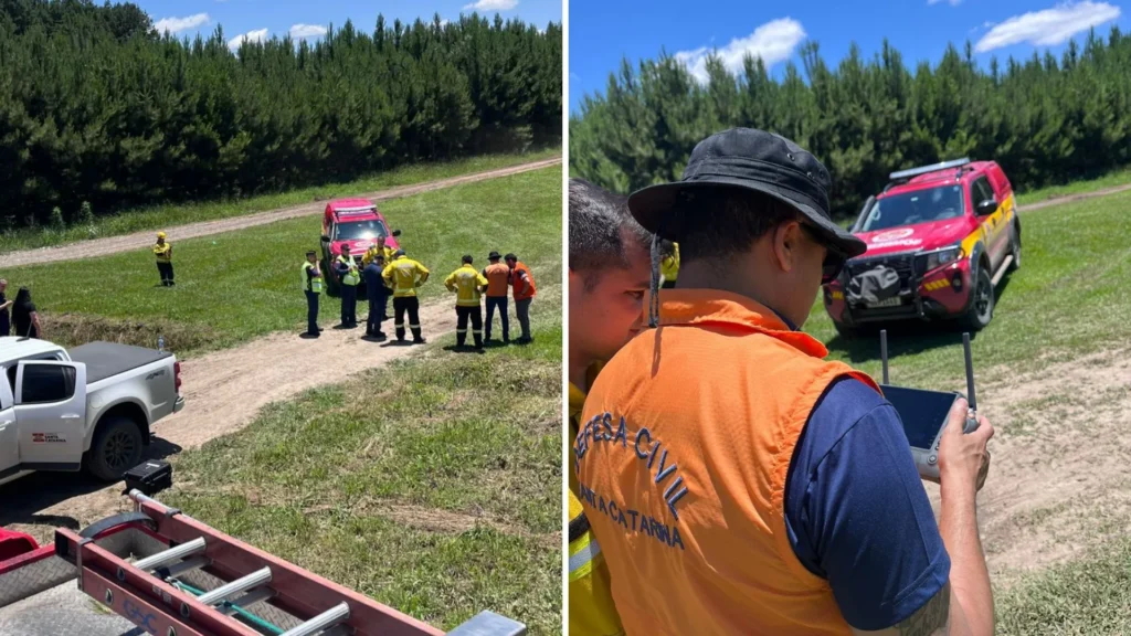 “Toda a área de possível ocorrência, inclusive a área ampliada para varredura, foi conferida por meio de buscas terrestres e aéreas, com apoio de drones com imageador térmico, não sendo localizado nenhum indício de queda”, destacou o CBMSC.