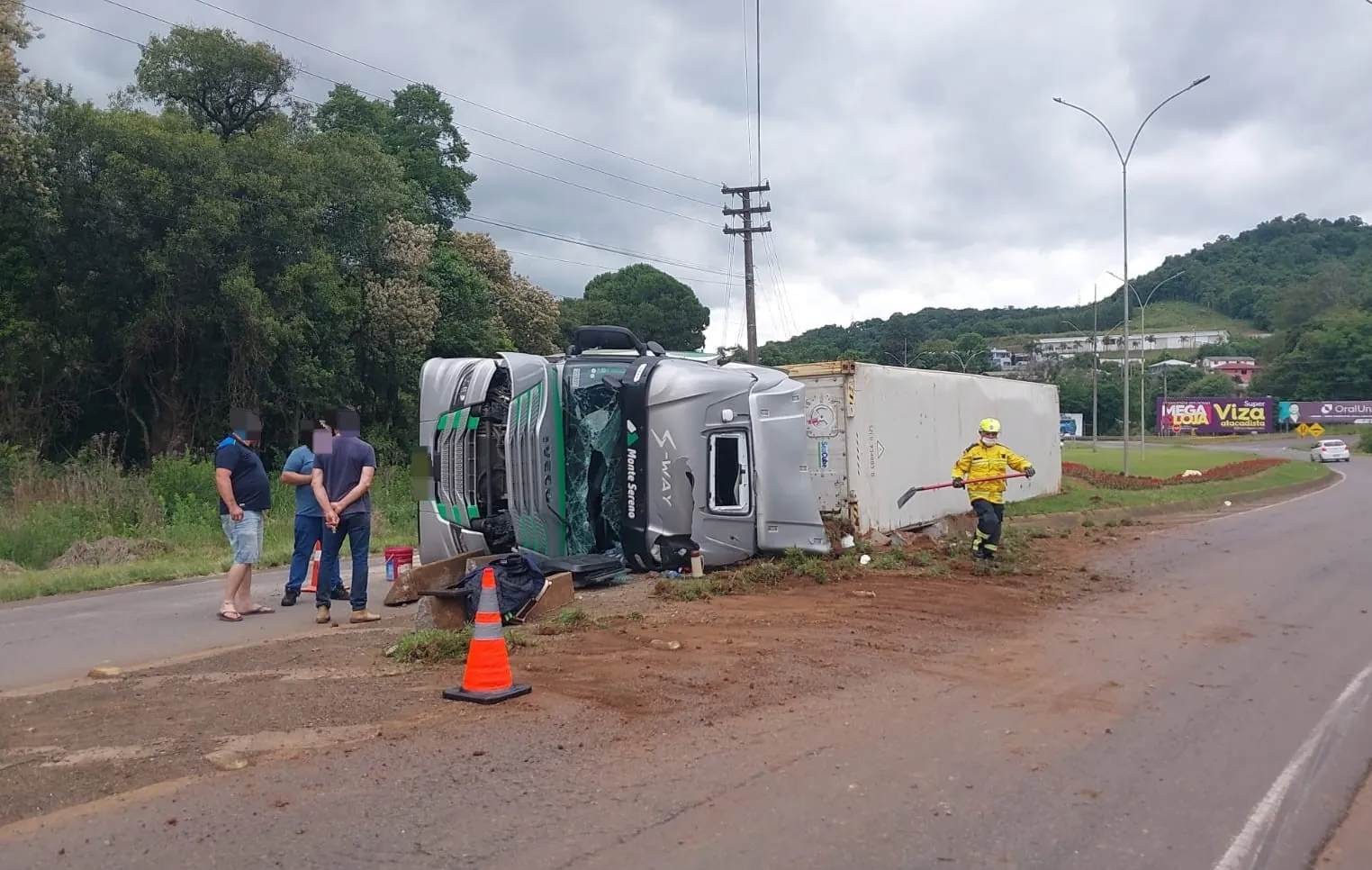 Ao chegarem ao local, os bombeiros confirmaram que um caminhão Iveco havia tombado sobre a pista. O veículo era conduzido por um homem de 50 anos, que apresentava um corte no braço esquerdo e relatava dores de cabeça.