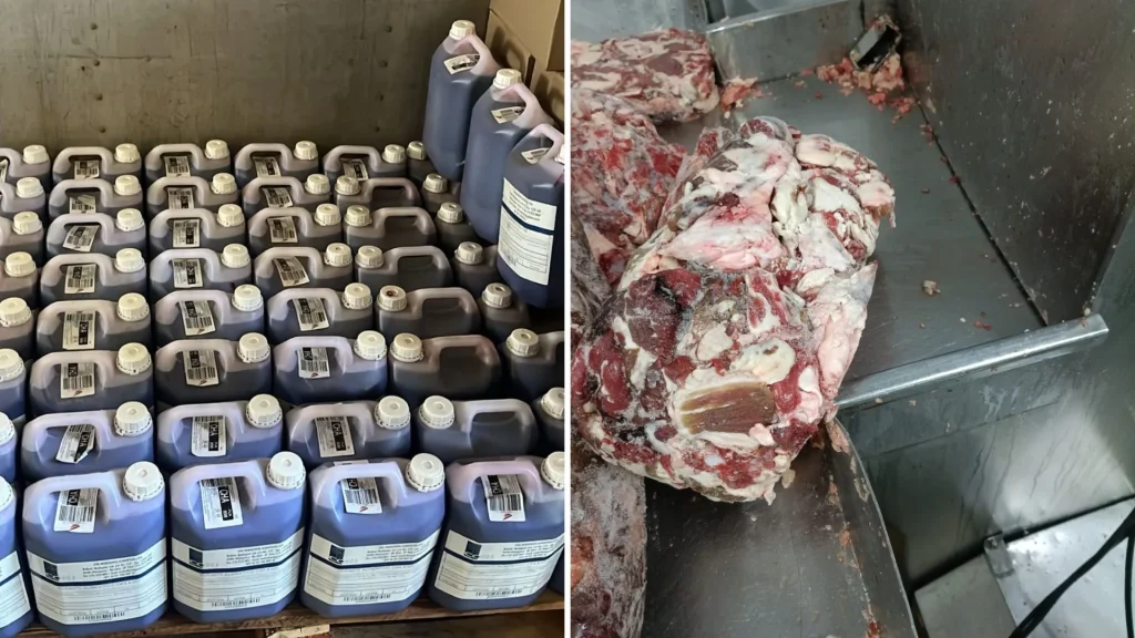 Já no depósito da distribuidora, em Chapecó, os fiscais apreenderam materiais que reforçam as suspeitas de adulteração. Entre os itens recolhidos estavam galões de corantes alimentícios vencidos, proteína de soja e subprodutos cárneos.