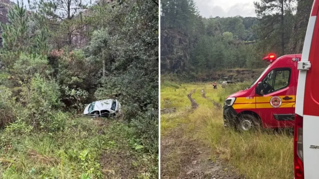 Isso porque as condições climáticas adversas, com chuva no momento do atendimento, somadas ao terreno acidentado, dificultaram o acesso das equipes até o local exato onde o veículo caiu.