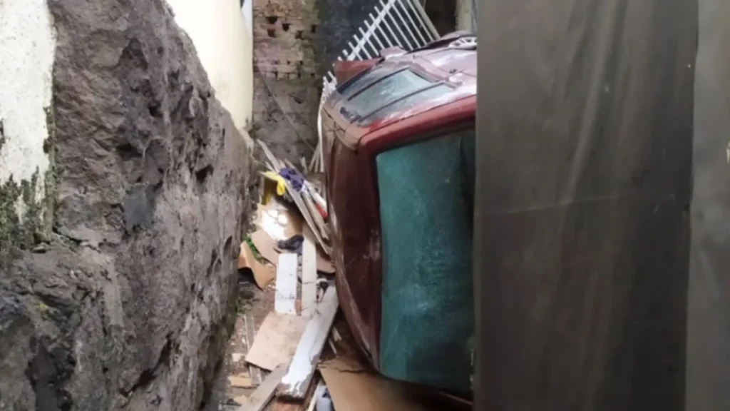 O veículo parou lateralizado ao lado do imóvel, deixando claros os danos significativos tanto na estrutura quanto no próprio automóvel.