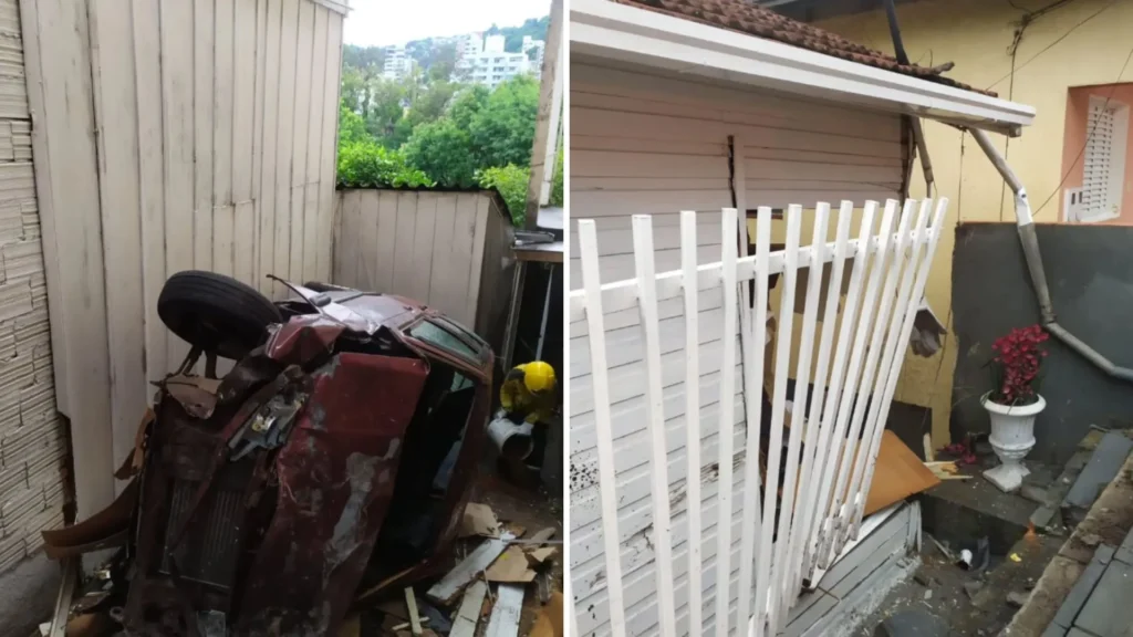 Ao chegar, os bombeiros constataram que um Fiat Uno havia saído da pista e invadido uma residência localizada em um nível inferior da rua.