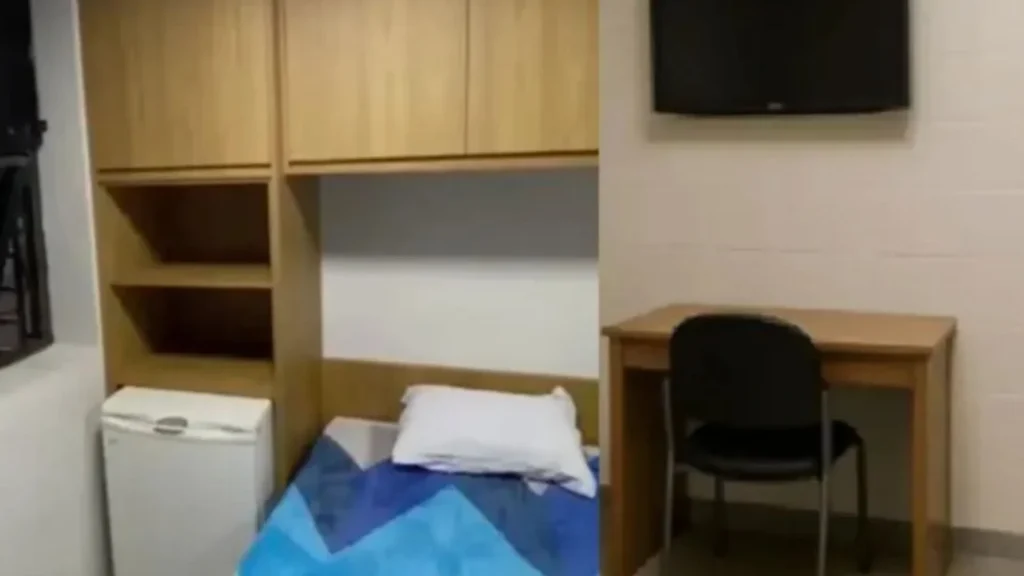 O novo espaço destinado a Vorcaro conta com sala, mesa, cadeira, cama de solteiro e banheiro privativo. Além disso, o ambiente possui ar-condicionado, janela, armário e frigobar.