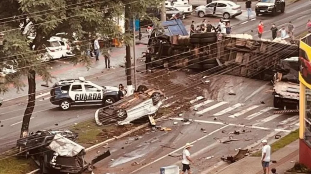 Câmeras de videomonitoramento registraram o momento exato do acidente, auxiliando nas investigações e na reconstrução da dinâmica do ocorrido.