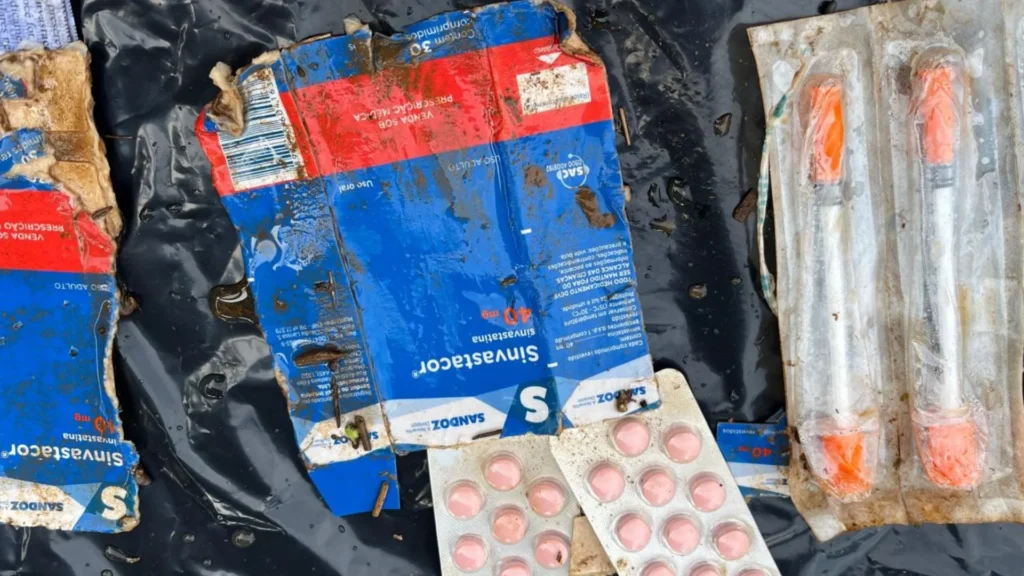 Durante a ação mais recente de monitoramento e limpeza, a equipe identificou um achado preocupante: seringas de insulina novas e medicamentos descartados irregularmente junto ao lixo comum acumulado pela barreira. Embora a quantidade total de resíduos permaneça dentro da média das últimas coletas, o tipo de material encontrado acendeu um alerta sanitário e ambiental.