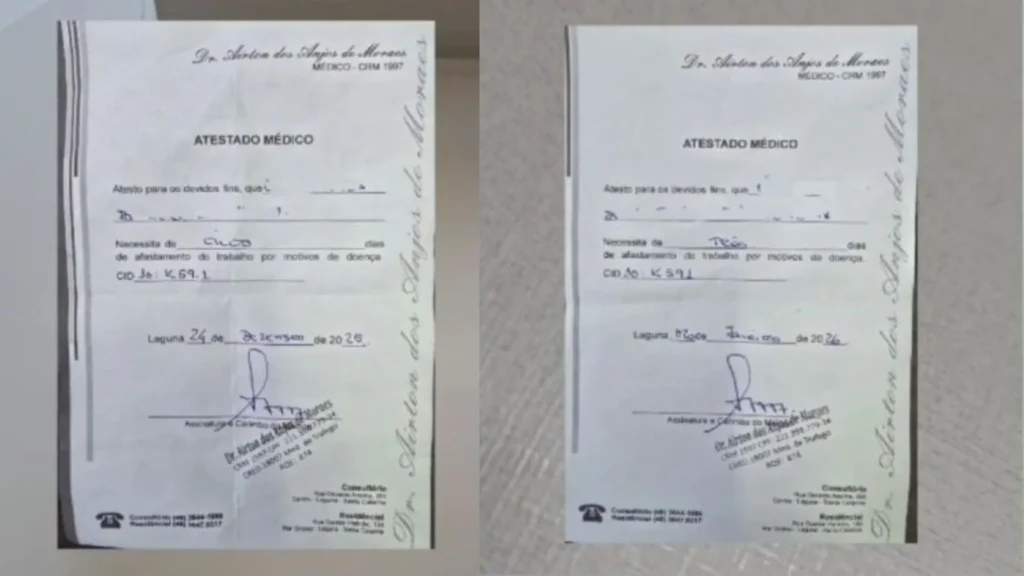 O vídeo mostra o funcionário solicitando um atestado de “três ou quatro dias”. O médico pede dados pessoais, indica que colocaria o CID de diarreia e faz comentários insinuando a necessidade de receber “umas carnes diferentes” porque estaria planejando uma festa. Segundo o empresário, o valor cobrado seria R$ 125, equivalente à metade de uma consulta.