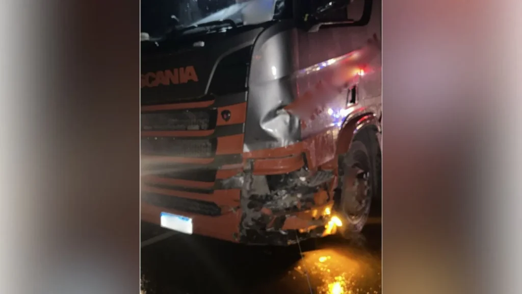No local colidiram um veículo VW Gol e uma carreta Scania. Além disso, uma árvore estava caída sobre a pista, bloqueando parcialmente o fluxo de trânsito.
